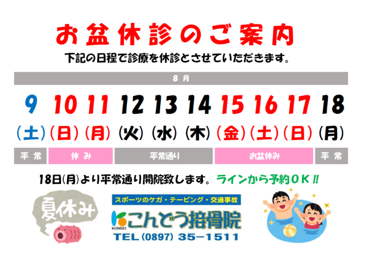 今年は下記の通り、お休みとさせていただきます。18日(月)から平常通りとなりますので、ご確認の上、ご予約をお取りください。